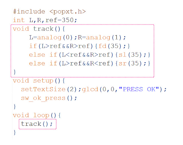 สำหรับโค้ดของ เซนเซอร์ 2 ตัวนำมาเขียนเป็นฟังก์ชั่นชื่อ track ได้ตามนี้