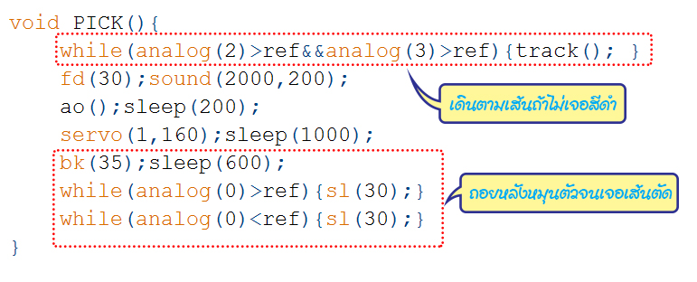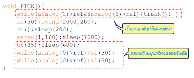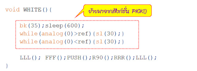 สังเกตุว่า ชุดคำสั่งถอยหลังหมุนตัวจนเจอเส้นตัดจากเดิมที่อยู่ในฟังก์ชั่น PICK() ถูกย้ายมาไว้ที่ฟังก์ชั่น WHITE() กับ BLACK() เรียบร้อยแล้วครับ