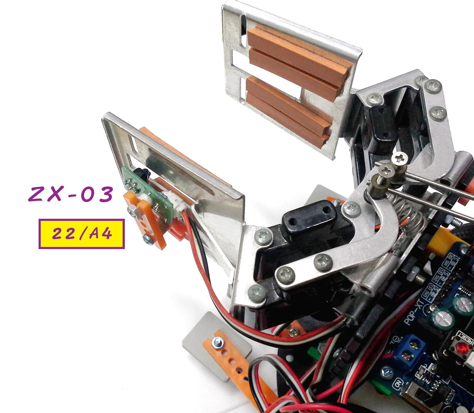 นอกจาก 4 ตัวที่ใช้เคลื่อนที่ตามเส้นแล้ว ยังมีตัวที่ 5 สำหรับเช็คกระป๋องอีกด้วย โดยติดตั้งเซนเซอร์ ZX-03 ไว้ที่ช่อง 22/A4 การอ่านค่าใช้คำสั่ง analog(4)